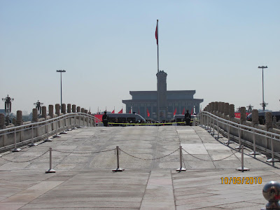 In the first photo below, behind us is the Great Hall of People. This building is the offices of the Standing People of Congress and is used for official government ongoing. In the photo to the right behind us are many things. The monunment you see is the Peoples Hero Monument. Behind it is the Mausoleum that houses the remains of Mao Zedong in a crystal coffin. And finally in front of that you can see a huge photo with a screen (has red background with chinese words on it). This photo is of Sun Yat-sen who is said to be the forerunner of the chinese revolution. On the screens (there is one you can't see in this photo) they had been showing the 60th anniversary parade that took place last year on Oct 1st. A huge floral arrangement had also filled part of Tiananmen Square while we were there. Sixty One years ago China became the New Republic of China.